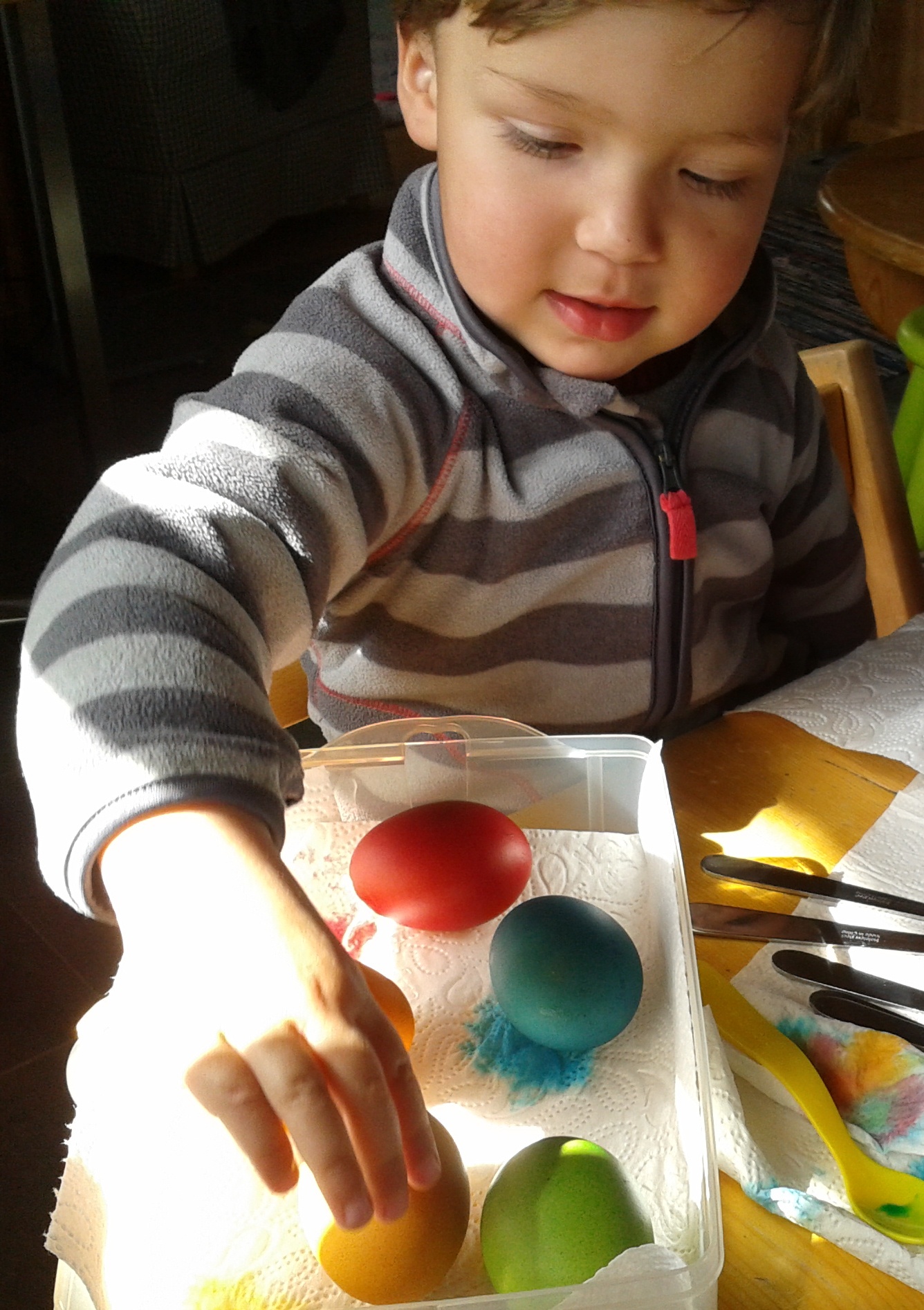 Das Osterfest ist eines der wichtigsten Feste in unserem Kirchenjahr. So viel gibt es dazu zu entdecken. Sei es in der Natur, wenn man sich mit dem Kind auf die Suche nach Palmzweigen macht, die man gemeinsam schmückt. Oder wenn man die ersten Frühlingskräuter für den Spinat oder die Kräutersuppe am Gründonnerstag sammelt. Nicht fehlen darf natürlich der Besuch im Hühnerstall: Kinder sammeln Eier und können diese für den Osterkorb oder für den Osterstrauß am Esstisch farbenfroh schmücken. Welch Stolz macht sich auf dem Gesicht der Kinder breit, wenn sie ihr erstes Ei rot, blau oder grün färben!