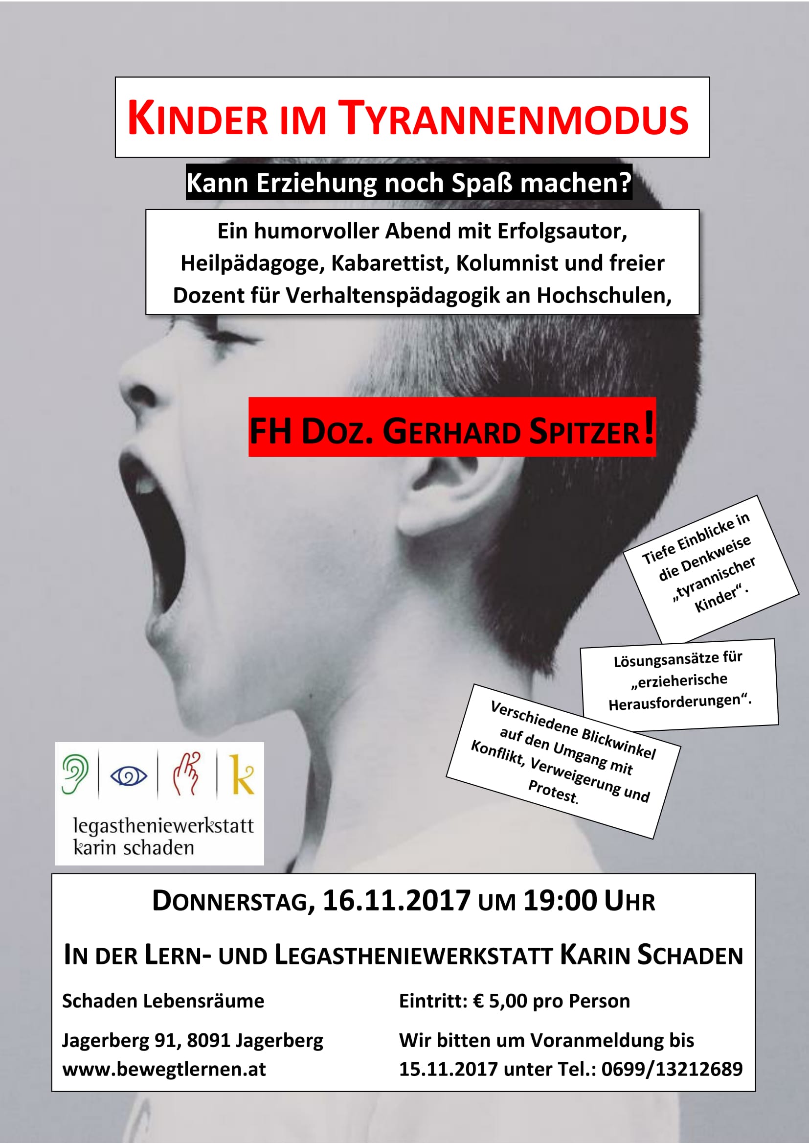 Wir laden recht herzlich zum Vortrag „Kinder im Tyrannenmodus“ mit dem Erfolgsautor FH Doz. Gerhard Spitzer ein. Der Vortrag findet am 16.11.2017 um 19:00 Uhr in der Lern- und Legastheniewerkstatt Karin Schaden (Jagerberg 91, 8091 Jagerberg) statt. Wir bitten um Voranmeldung bis 15.11.2017 unter Tel.: 0699/13212689. Eintritt: € 5,00 pro Person Wir freuen uns auf […]